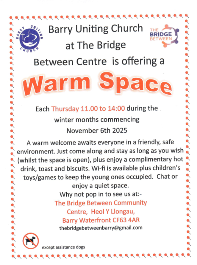 Our Warm Space is open every Thursday 11.00 am – 2.00pm commencing 6th November. Everyone welcome!
